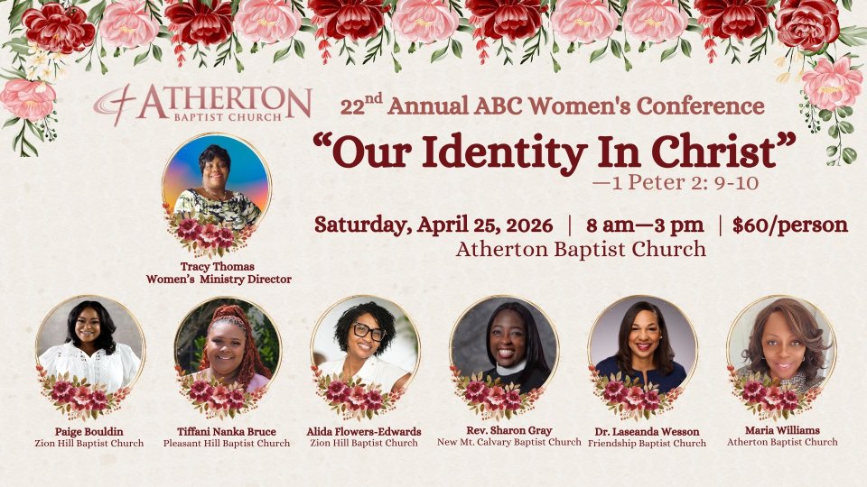Join us in supporting Lady Paige Bouldin and Alida “Chrissy” Flowers as they share at the Women’s Conference hosted by Atherton Baptist Church on Saturday, April 25, 2026 from 8:00 AM–3:00 PM. We celebrate the opportunity for them to pour into the lives of other women and represent our church family. Please keep them in prayer as they minister.