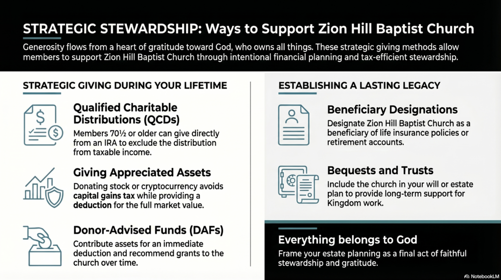 "The Bible teaches that giving is a part of growing in our faith. It is a response to God’s good gifts to us, and it is an act of worship toward Him. The ministry of Zion Hill Baptist Church is funded by God’s provision through the faithful members and attendees. Because of your consistent, meaningful, and cheerful giving, we are able to do all that we do here!"